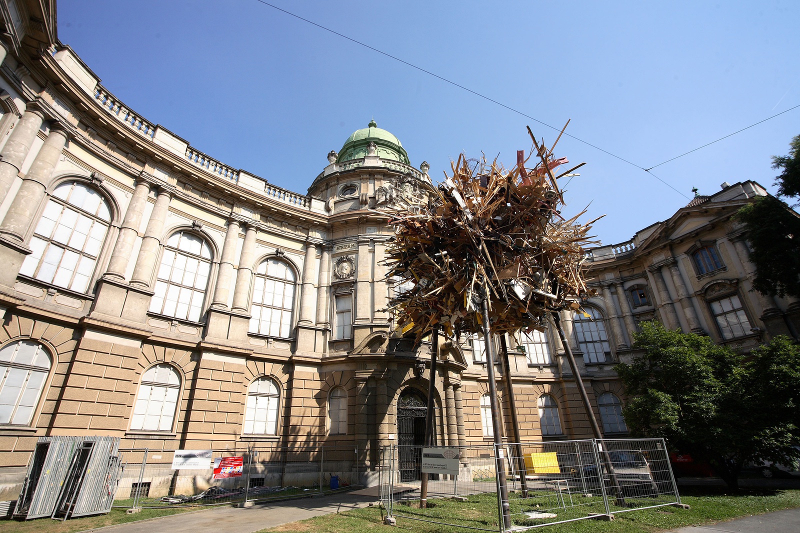 Wer erinnert sich noch an die Latenten Utopien? Fünf Jahre, nachdem die prominente Architektur-Schau im Grazer Landesmuseum Joanneum zu sehen war, hat nun das Kunstfestival steirischer herbst sein Festivalzentrum im selben Gebäude aufgeschlagen. Und während die damals gezeigten Windschlüpfrigkeiten von Hadid & Co auf der diesjährigen Architekturbiennale in Venedig zum hoffentlich letzen Mal abgefeiert werden, baut man in Graz statt elitärer Visionen lieber konkrete Realität ins Palais. Aus Baumüll und alten Möbeln haben die Architekten von raumlaborberlin nicht nur Festivalzentrum und herbstbar gestaltet, sondern auch noch eine Explosion vors Haus geparkt. Hands-on, Ready-made, Low-Budget/ No-Budget: Das sind Themen, die man auch der Biennale dringend ans Herz legen möchte.